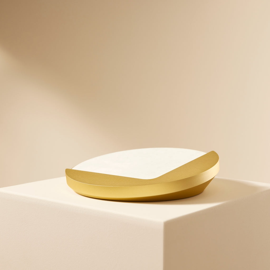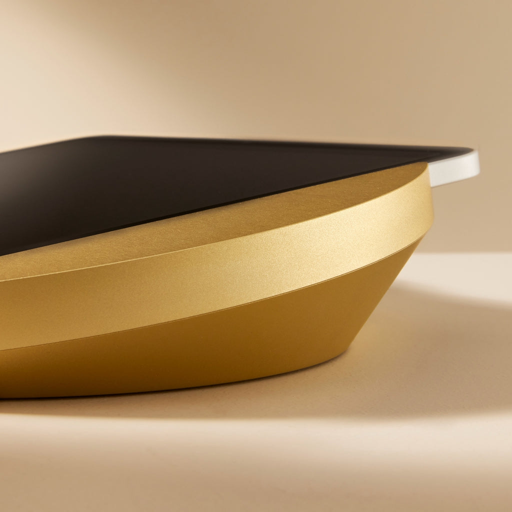 Sunset gleicht einer untergehenden Sonne, die das iPad sanft umschliesst. Die einseitig offene Tischkonsole wird aus präzise gefrästem Aluminium gefertigt, oberflächenbehandelt und eloxiert.