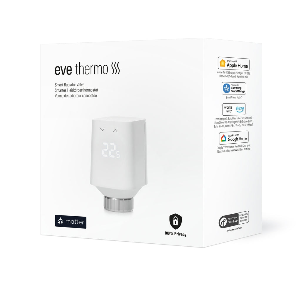 Profitiere von einem reaktionsschnellen und robusten Smart Home dank Thread-Technologie – alles, was du brauchst, ist eine kompatible Steuerzentrale. Mit Matter-Technologie ausgestattet, bietet Eve Thermo herausragende Benutzerfreundlichkeit und fortschrittliche Sicherheit. Lass die ganze Familie dein Zuhause steuern – egal ob mit iPhone, Android-Gerät oder per Sprachbefehl mit Alexa, Siri oder Google Assistant