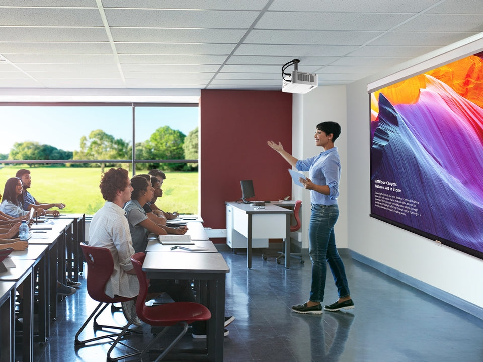 Intuitive Funktionen wie Sofort-Ein/Ausschalten, Keystone-Korrektur (horizontal/vertikal), Vier-Punkte-Bildanpassung sowie 360°-Projektion erlauben flexible Installationen – auch für Bodenprojektionen in Klassenzimmern.